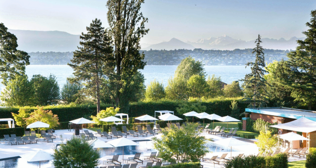 On the shore of the Lake Leman, in Geneva, panoramic views over the lake, mountains and Mont Blanc…